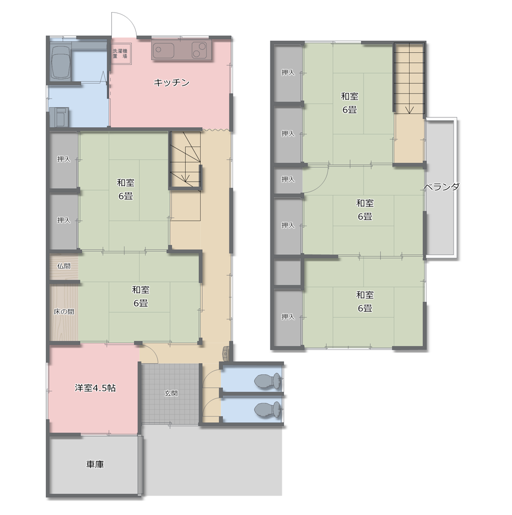 | 1階 | DK、和室×2、洋室×1、トイレ、洗面脱衣室、風呂 |